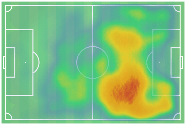 The heat map demonstrates how Guardiola has changed De Bruyne’s game to heavily play in the right half-space as a number 8 and create chances that way. The interesting aspect of this heat map is how willing De Bruyne is to get back in the defensive phase to help out his team. I believe Guardiola has instructed him to play as a number 10 along with the other advanced playmaker when City are in possession. However, when the team is out of possession, he reverts to an 8.